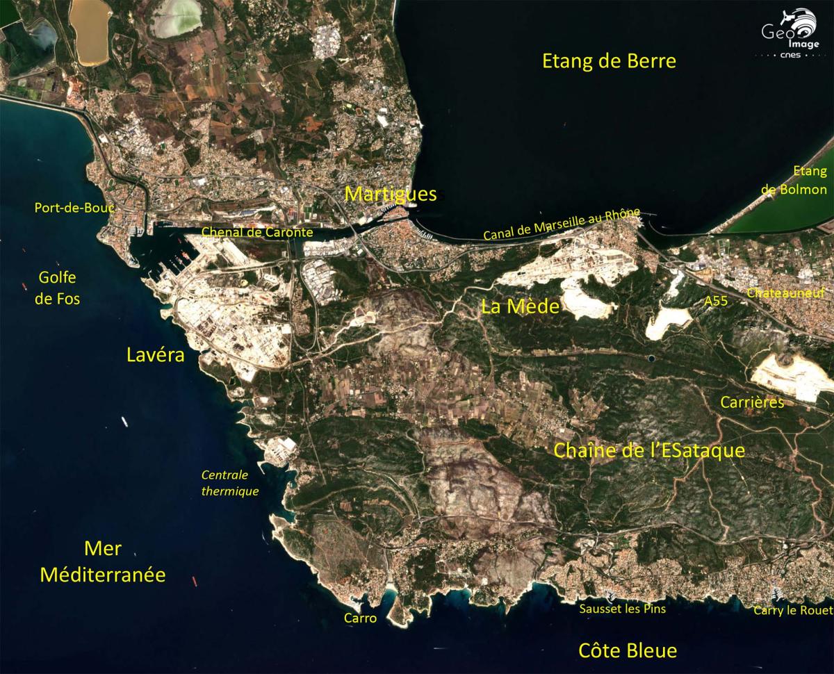 Sur cette image, on voit que l’étang de Berre est un écosystème lagunaire complexe qui rassemble en fait quatre étangs en communication plus ou moins importante : le Grand étang au centre, l’étang de Vaïné à l’Est, l’étang de Bolmon au Sud et l’étang de l’Olivier au Nord-Ouest. En Europe, les lagunes côtières sont particulièrement importantes autour de la Méditerranée et celle de Berre est la plus vaste ; à tel point qu’elle fut longtemps qualifiée de “mer” par Elisée Reclus à la fin du XIXe siècle : “la non-utilisation de cette petite mer comme port de refuge et de commerce est une sorte de scandale économique”.