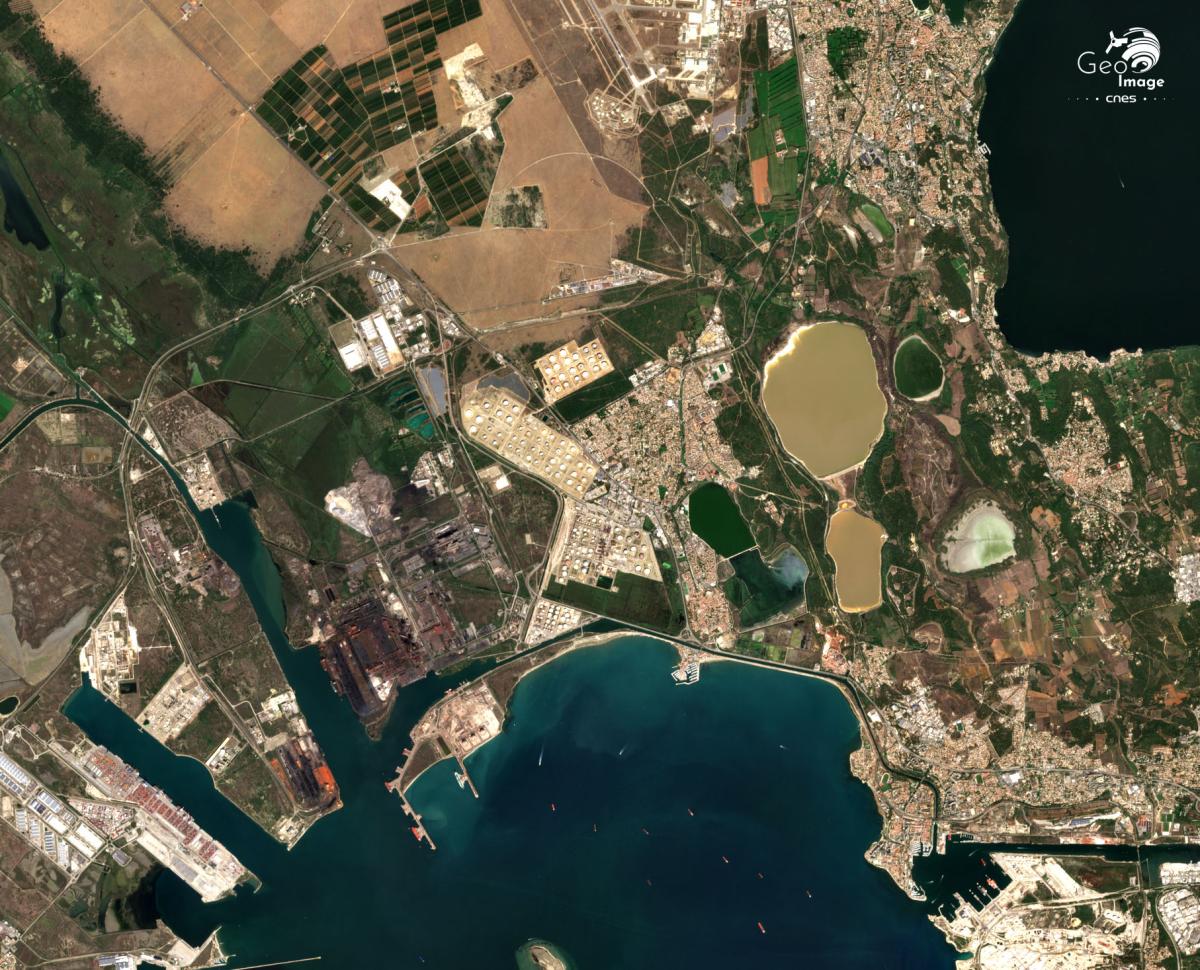 Au Sud-Ouest de l’étang de Berre, le site industrialo portuaire de Fos-sur-Mer domine cet espace. D’Ouest en Est, nous voyons Eurofos, terminal à conteneurs, puis les usines Eiffage et Lyondell (chimie), l’usine Arcelor Mittal (en noir) et enfin la raffinerie Esso.