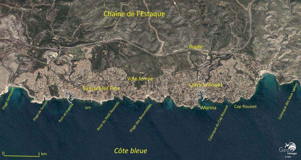 La chaîne de l’Estaque et la Côte bleue. Entre Marignane et Martigues, l’urbanisation est interrompue par l’étang protégé de Bolmon et ses marais en vert clair. Plus au Sud, au-delà de l’autoroute A55, la chaîne de l’Estaque forme une coupure avant la Côte bleue. Ses stations balnéaires sont devenues des communes périurbaines aisées - Carry le Rouet, Sausset les Pins - de l’agglomération de Marseille. La Côte bleue offre des paysages très différents des usines de l’étang à quelques kilomètres à vol d’oiseau. C’est un littoral très convoité et très touristique mis en valeur par des peintres ou des réalisateurs (cf. R. Guédiguian).