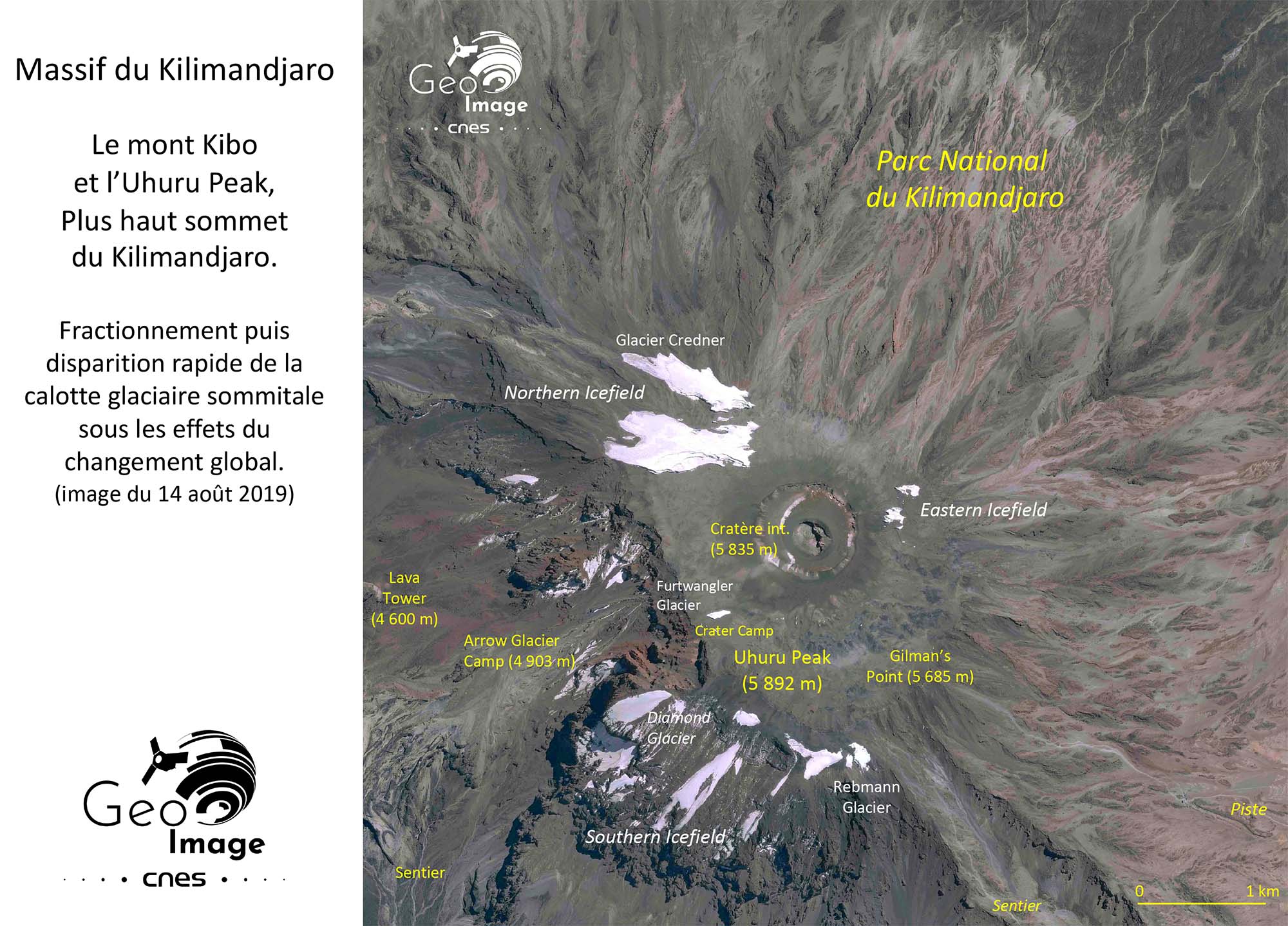 La comparaison entre cette image d’une très grande clarté et la carte des relevés de 2018 (Cullen et allii) témoigne d’une nette accélération du recul. A certains endroits, la perte de masse des glaciers au sommet de la montagne atteint 70 % entre 2014 et 2020. On doit relever en particulier la quasi-disparition du champ de glace oriental (Eastern Icefield) et la très forte réduction des surfaces occupées par le champ de glace méridional (Southern Icefield) ; le glacier Decken et Little Breach ayant par exemple quasi-disparus. Dans le champ septentrional (Northern Icefield), la nette séparation est consommée entre le Glacier Credner et el Drygalski. Selon de nombreux observateurs, la disparition complète des champs de glaces sommitaux devrait devenir effective entre 2025 et 2035.