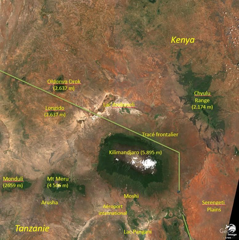 Plus au nord, par delà, au Kenya, la cuvette du lac Amboseli, dont la couleur très claire souligne l’aridité et la médiocrité de la couverture végétale, au centre de l’image, on aperçoit, isolés, au sud - en Tanzanie donc, la montagne de Longido (2637 m), et, un peu plus au nord, juste au-delà de la frontière, le massif d’Oldonyo Orok (2524 m).