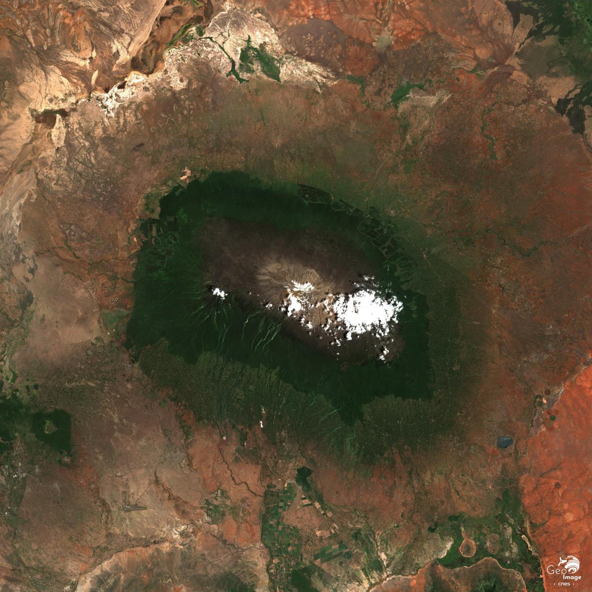 Cette image en haute définition fournie par le satellite Pléiade datant du 14 août 2019 couvre le sommet du Mont Kibo, qui est le plus élevé du massif du Kilimandjaro. Bien visible, l’Uhuru Peak - qui culmine à 5 892 m. d’altitude – est le plus haut sommet du continent africain.