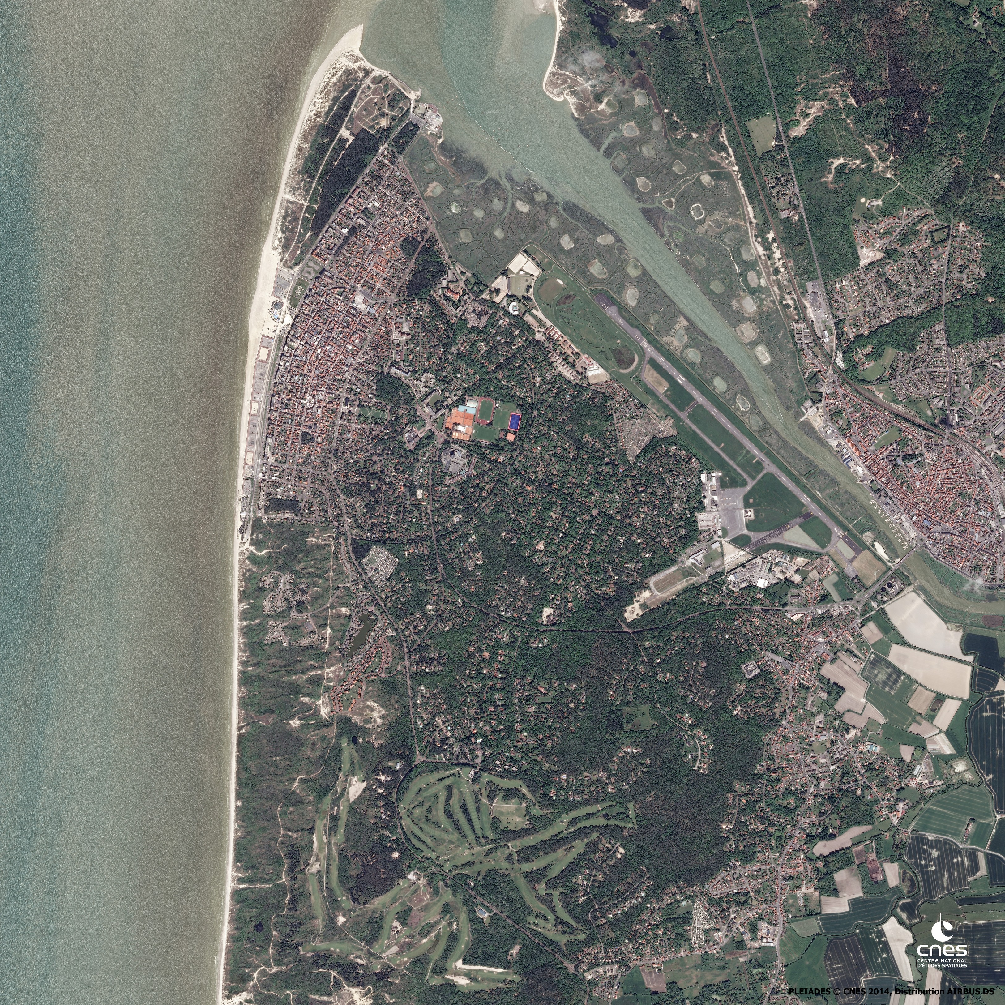 Le reste du territoire de la station du Touquet-Paris-Plage est divisé entre le littoral dunaire où se situe la première station héritière du XIXème siècle, un vaste domaine boisé en position d’abri et un espace agricole après les deux villages de Cucq et du Trépied qui achève l’image vers l’est. De l’autre côté de la Canche, la ville d’Etaples occupe tout le nord-est de l’image. Forte d’environ 11 000 habitants ; elle est ville « support » depuis l’origine pour le Touquet-Paris-Plage.