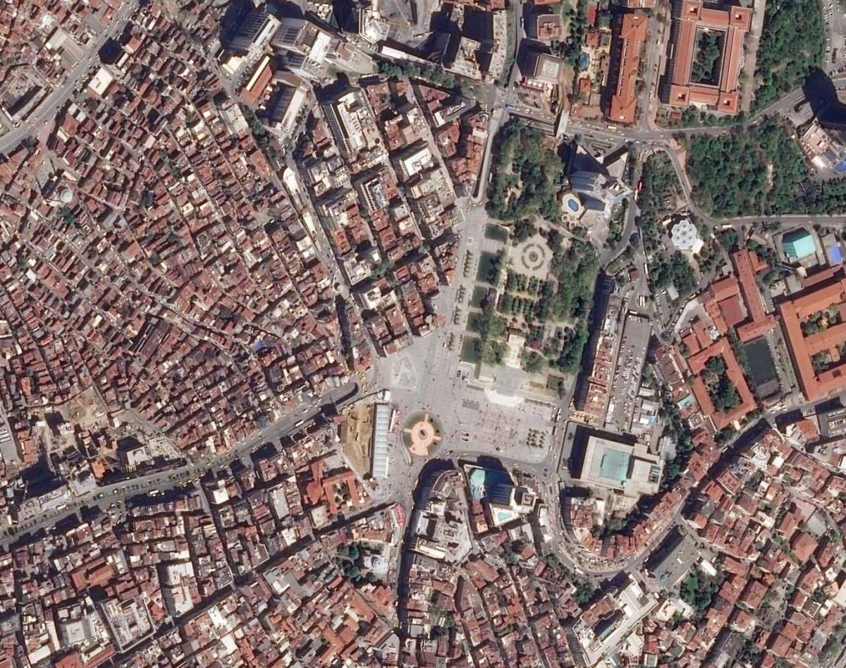 El zoom se centra en la plaza Taksim y el parque Gezi. En el sur y el este de la plaza se extienden barrios de urbanizaciones antiguas relacionadas con el barrio de Beyoğlu. De apariencia modesta desde el cielo, la avenida peatonal del Istiklal, arteria comerciante, es la espina dorsal de este barrio cuya vida nocturna es intensa y a menudo alcoholizada.