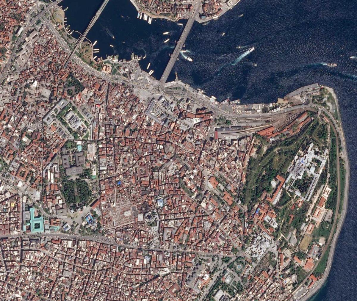 El palacio imperial otomano de Topkapıy sus jardines ocupan la punta muy verde de la península. Hacia el sur se alzan el museo de Santa Sofía y la mezquita de Sultanahmet. Hacia el oeste, los techos de tejas del Gran Bazar se singularizan en el seno de la urbanización residencial. Siguen el campus universitario de Estambul, pegado a la gran mezquita imperial de Süleymaniye. Si la universidad y las mezquitas imperiales siguen funcionando, los monumentos que albergaban las funciones públicas y comerciales forman parte ahora del patrimonio. El palacio de Topkapı, Santa Sofía y el Gran Bazar corresponden a partir de ahora al corazón del espacio turístico de Estambul.