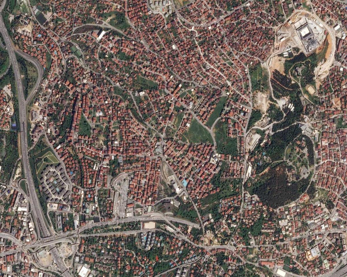 El espacio representado es empinado. Un parque urbano ocupa la cumbre de la colina de Çamlıca (276 m) mientras que urbanizaciones residenciales rodean la colina y se extienden por el resto de la imagen. A pesar de una topografía poco legible en la imagen satélite, la disposición del tejido urbano y de la red vial da indicaciones a propósito del relieve, como si se tratara de curvas de niveles.