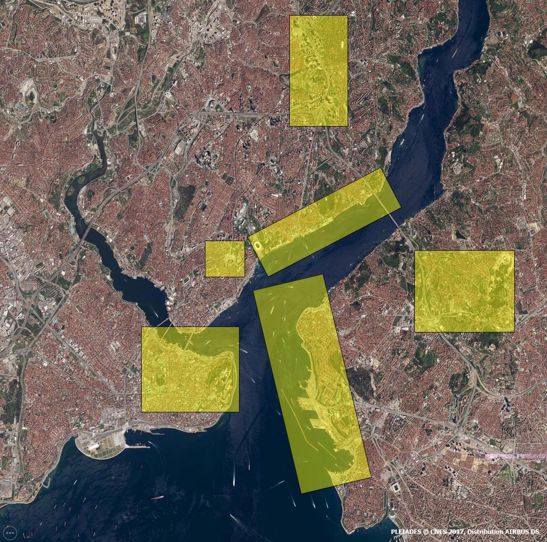 Esta imagen enfoca en la aglomeración actual de Estambul. La imagen incluye a la vez el Estambul “histórico” - la ciudad antigua – y los barrios que resultan de las primeras décadas de exurbanización de los años 1950-1980 hacia el norte y en la ribera anatolia.