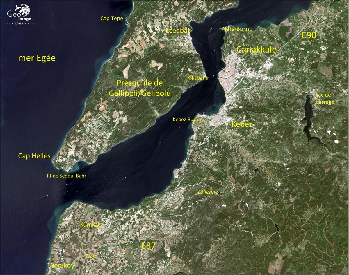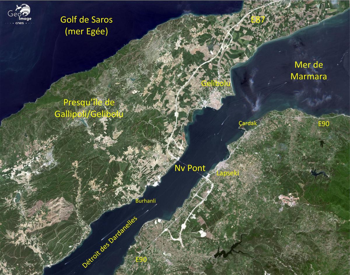 L’image laisse bien apparaitre l’étroitesse des structures. Au nord-est de Gelibolu, la péninsule de Gallipoli n’est plus qu’une étroite langue de terre de seulement 4,8 km de large. Entre Gélipolu et pointe de Çardak, le Détroit est large de seulement 3,3 km alors que plus au sud elle ne fait plus que 3 km vers Burhanli.