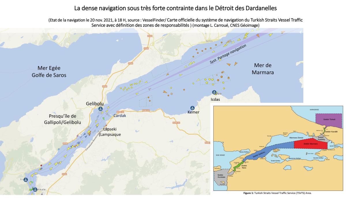 Long de 377 km, le trajet maritime des Détroits turcs relie la mer Noire à la mer Égée, donc la Méditerranée, par le Détroit du Bosphore et Istanbul, la mer de Marmara et le Détroit des Dardanelles. Depuis les années 1990, un système de gestion du trafic cherche à y sécuriser la navigation face à de fortes contraintes de navigabilité. Site de contact entre deux espaces maritimes et deux blocs continentaux, les péninsules anatolienne et balkanique, ces Détroits sont un carrefour et un verrou d’un intérêt géostratégique majeur, âprement disputés depuis la Haute Antiquité. Si la Turquie affirme sa pleine souveraineté sur les Détroits depuis la Convention de Montreux de 1936, cette dernière étant son champ géographique d’application à toute la mer Noire; conférant à celle-ci un statut maritime géostratégique exceptionnel dans le monde. En limitant les transits dans les Détroits turcs, elle bloque à la fois l’entrée massive des marines des forces de l’OTAN en mer Noire et la sortie massive de la marine russe en Méditerranée.