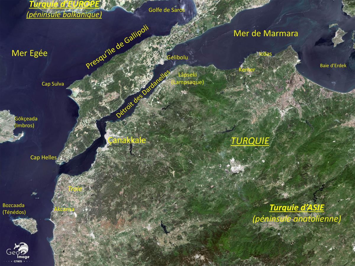 Le Détroit des Dardanelles, l’ancien Hellespont de l’Antiquité, situé sur la mer Égée s’étend du Cap Helles et de la pointe de Seddul Bahr à l’ouest jusqu’au phare de Gallipoli/ Gelibolu à l’est. Il mesure 61 km de long. Comme le montre bien l’image, sa largeur varie fortement : elle va de 1.200 m. devant la ville de Çanakkale (cf. zoom) dans sa partie la plus étroite à 4.000 m. dans sa partie la plus large. De même, sa profondeur moyenne de 55 m. masque de grandes différences, qui vont de 45 m. à 103 m. Au plan tectonique et morphologique, le Détroit des Dardanelles correspond à une ancienne vallée fluviale installée dans un vaste creux, ou zone synclinale, qui a été envahie par la mer lors de l’élévation du niveau marin - ou transgression marine - à la fin du quaternaire.