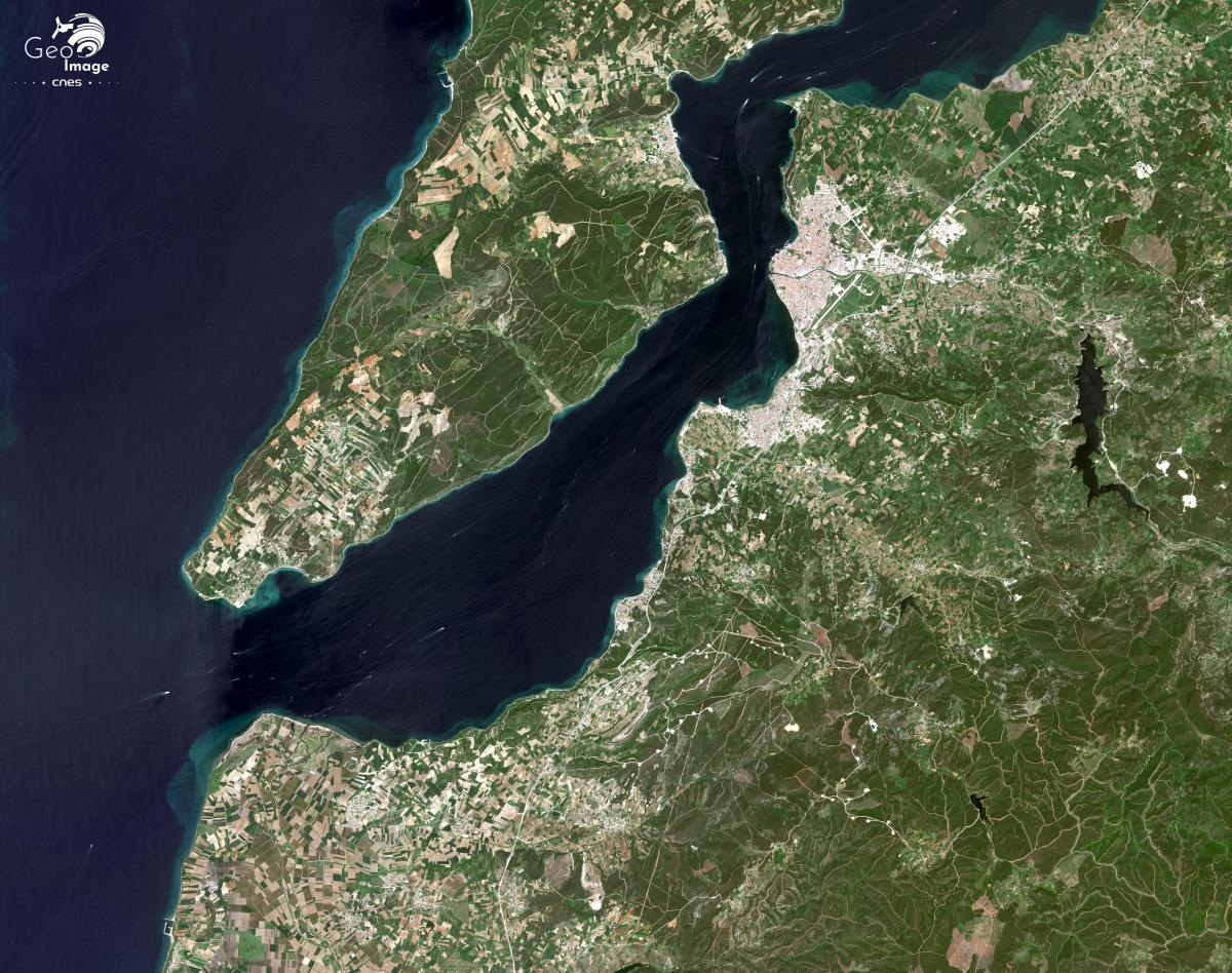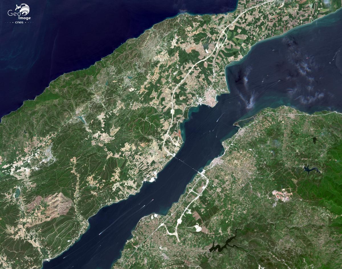 Cette image du détroit des Dardanelles, passage maritime reliant la mer Égée à la mer de Marmara a été prise par le satellite, Sentinel-2A le 12 mai 2021. Il s'agit d'une image en couleur naturelle et la résolution est de 10m.