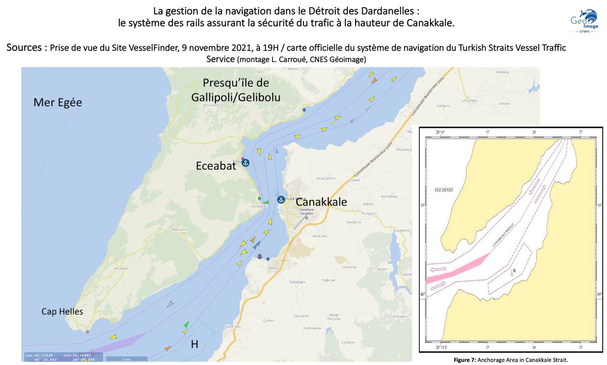 Les Détroits turcs sont un terme général définissant l’espace régional mettant en contact la mer Noire au nord avec la mer Égée, et donc la mer Méditerranée, au sud. Il est constitué de trois sous-ensembles bien distincts faisant système : le Détroit des Dardanelles au sud, la mer de Marmara au centre et le Détroit du Bosphore au nord. Ne présentant que le Détroit des Dardanelles, l’image ne couvre donc pas l’ensemble du dispositif régional des Détroits qui s’étend globalement sur 180 km Nord/Sud et 350 km Ouest/Est. Juridiquement en droit international, toutes les eaux de la mer de Marmara, du Détroit des Dardanelles, du Golfe de Saros, du Détroit du Bosphore et celles longeant le littoral turc de la mer Égée et de la mer Noire ont le statut de « mer intérieure » turque.