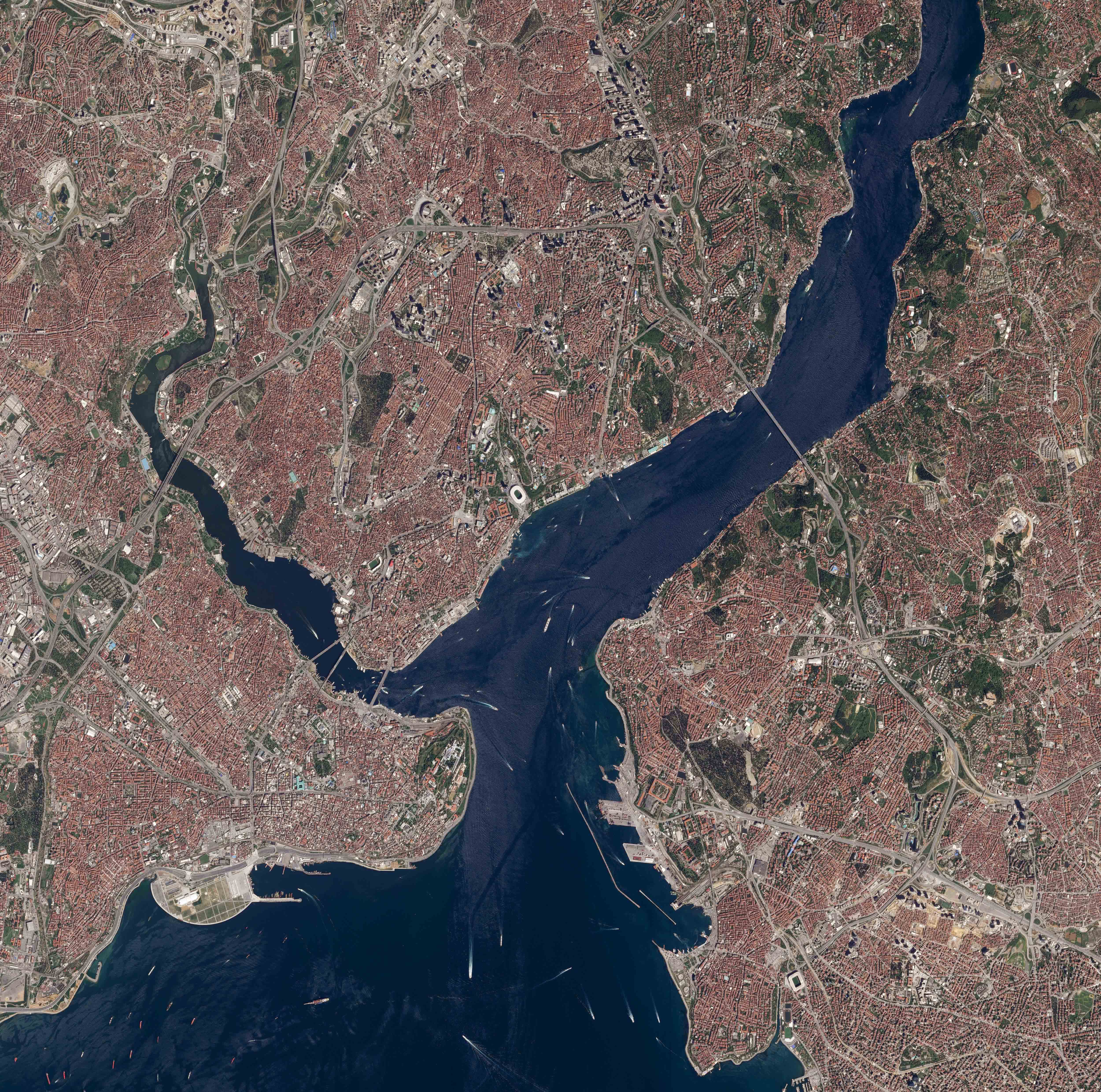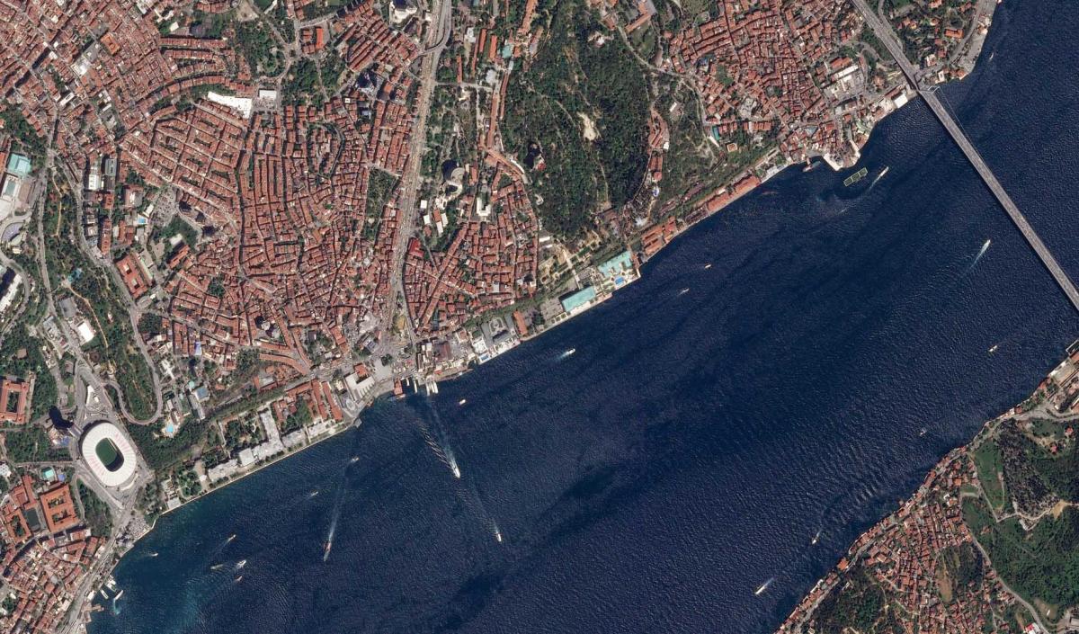 Pour les plus grands bateaux naviguant dans un axe nord-sud ainsi que les bateaux immobiles au sud-ouest de l’image (qui ne sont pas suivis d’une traînée d’écume), le Bosphore est un passage obligé permettant de relier la Mer noire à la Méditerranée puis à l’Océan mondial.