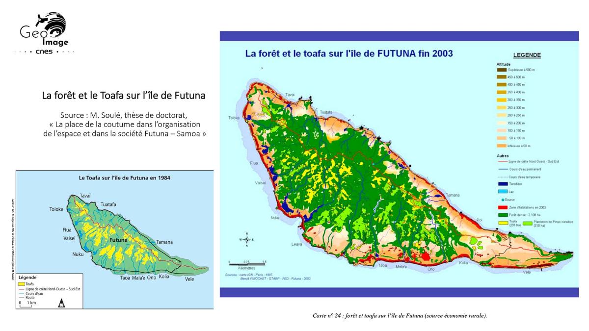 Futuna, comme le montre l’image, est un ensemble montagneux bordé par un récif frangeant plus ou moins large. Futuna avec 45 km² est la plus grande des deux îles. Elle atteint 15 km dans sa plus grande longueur, 4,5 km dans sa plus grande largeur et culmine à 524 mètres au mont Puke. Le relief est plus marqué au Nord-Ouest qu’au Sud où le mont Mamati atteint 102 mètres. On distingue au Sud-Est de Futuna l’aérodrome de Vele. Au centre de l’île, se localise la baie de Leava, seule baie et seul mouillage pour les navires qui approvisionnent l’île à raison d’une à deux rotations par mois. A l’opposé, la mise en valeur des périphéries est essentiellement agricole.