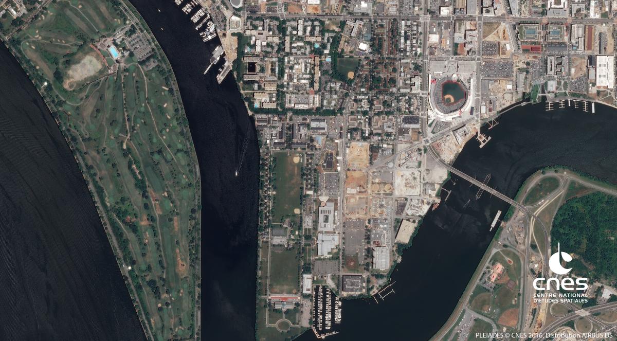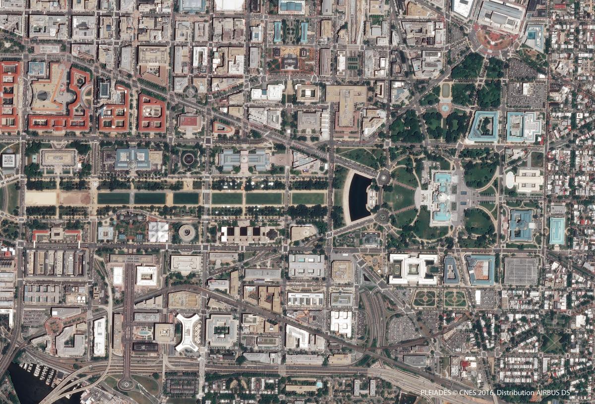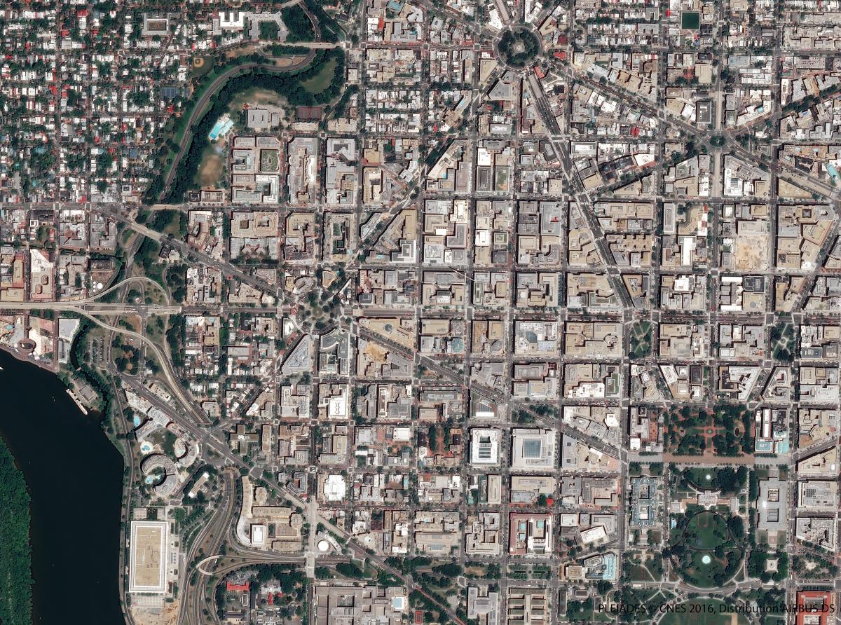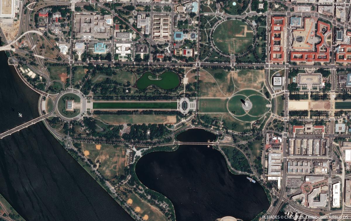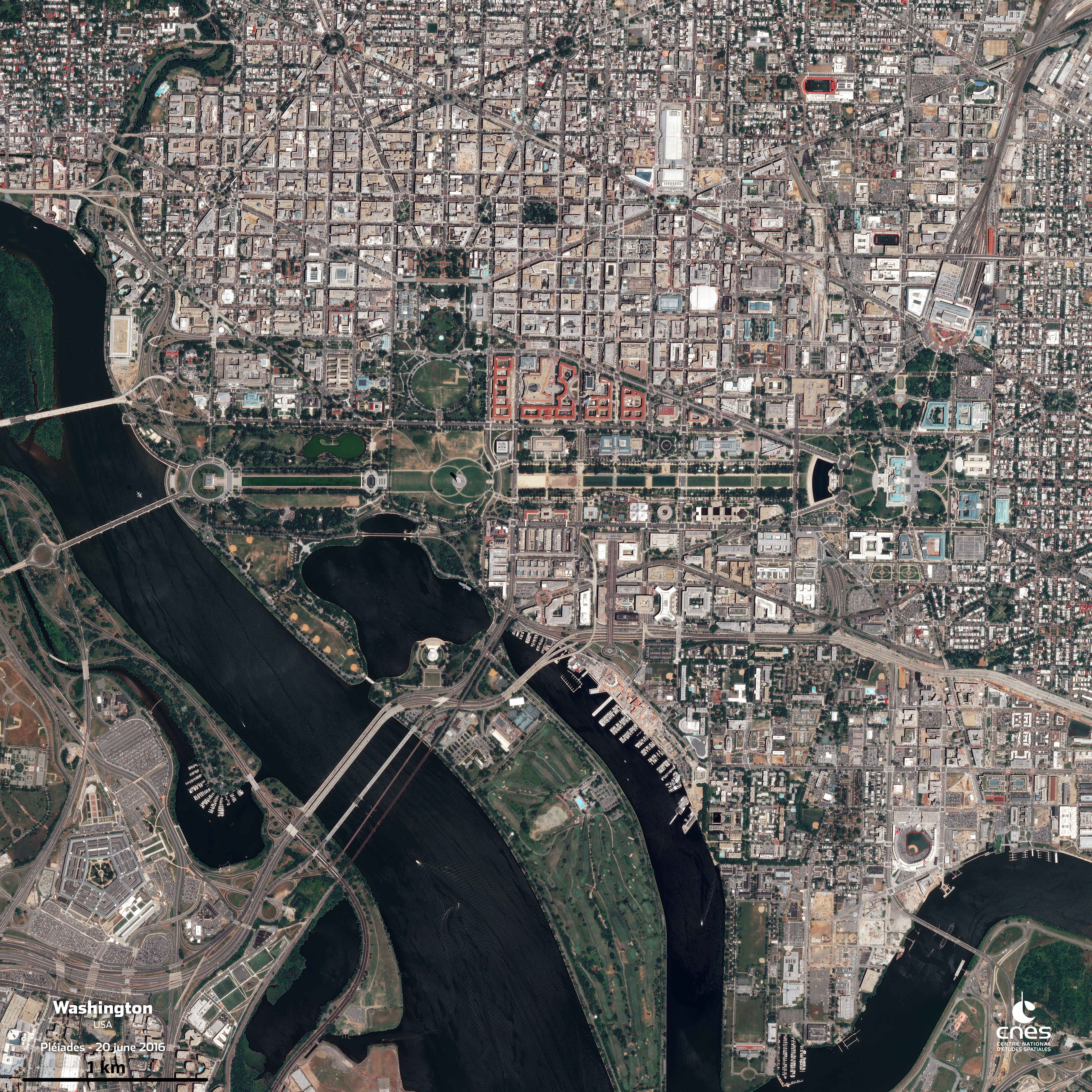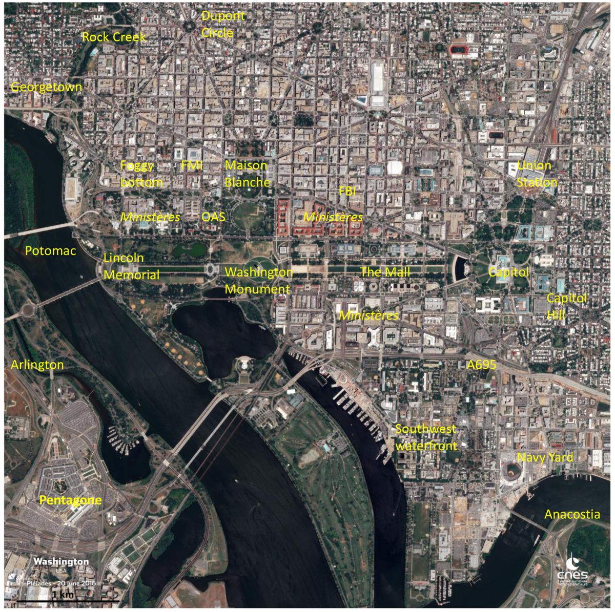 L’image couvre l’hypercentre du “10 miles square”, le site originel de la ville, sur la rive nord du Potomac qui coule du Nord vers le Sud. Le fleuve marque la limite administrative entre le District of Columbia au nord-est, et la Virginie au sud-ouest, où est visible une partie de la ville d’Arlington. Le confluent avec la rivière Anacostia se dessine au sud-est, tandis qu’au nord-ouest la Rock Creek river marque la limite avec le quartier historique de Georgetown, ville fondée au XVIIIe siècle et devenue quartier de Washington.