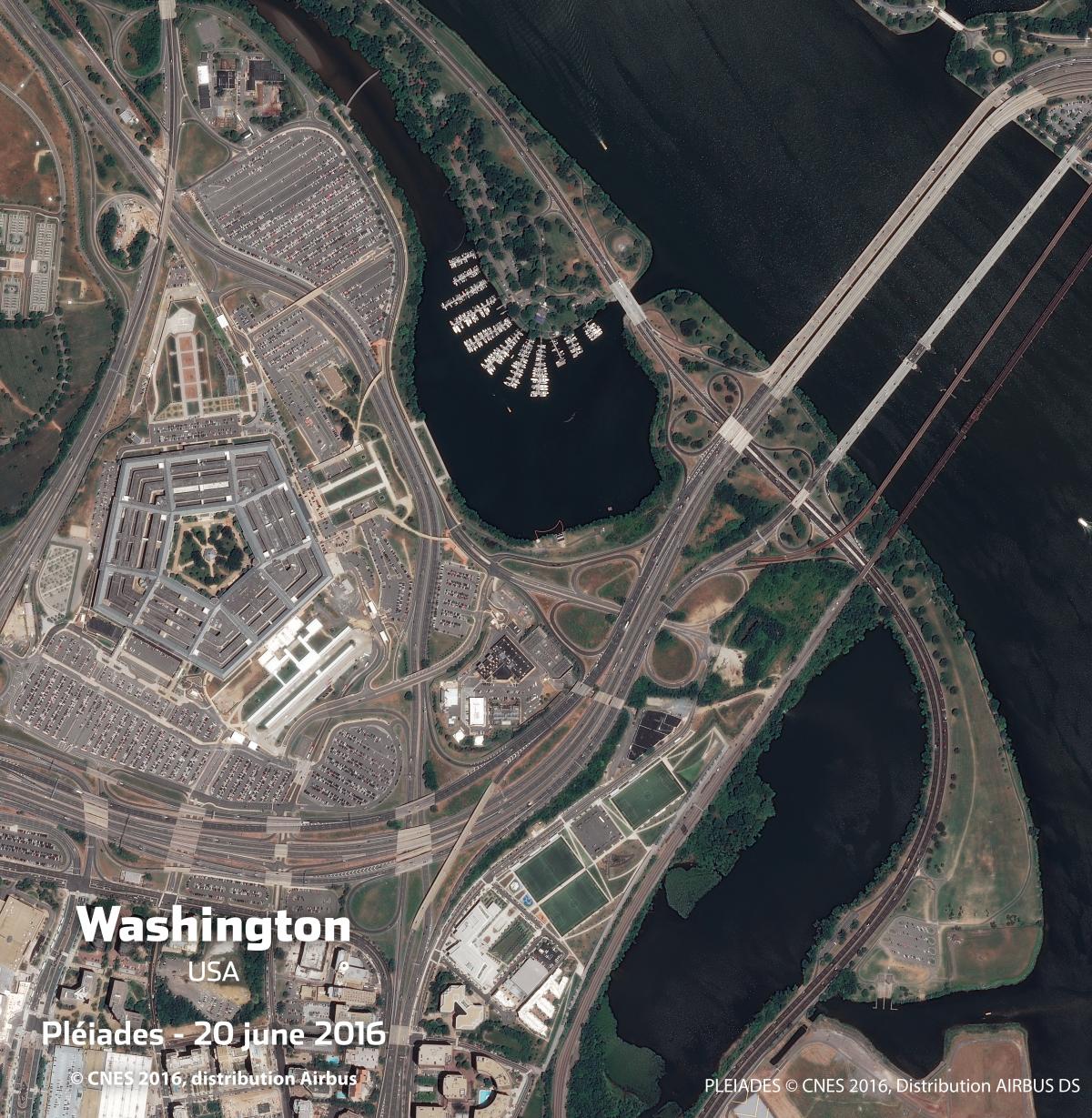 L’image est en grande partie occupée par le Pentagone, siège du département de la Défense. Il est situé sur la rive droite du Potomac, à Arlington en Virginie, au sud du Cimetière national d’Arlington. Au sud-est débutent les pistes du Ronald Reagan National Airport.