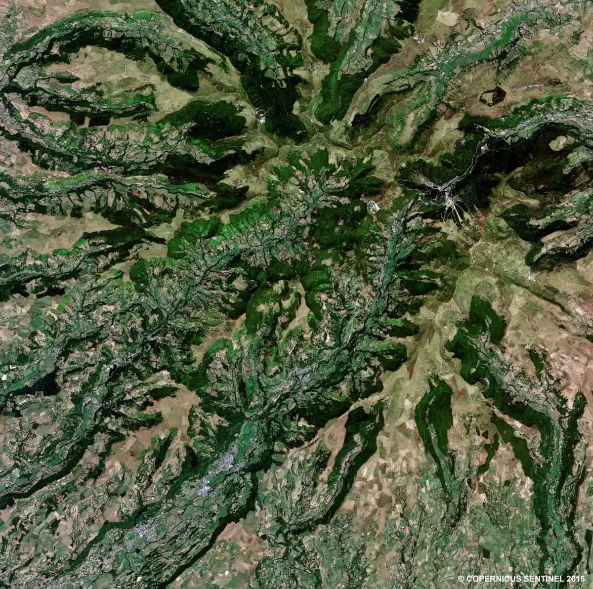 Cette région rurale, où les versants des vallées sont largement boisés, est fortement marquée par l’activité agricole. Les paysages bocagers sont bien ajustés à une économie herbagère (visibles au travers des parcelles de couleur verte sur l’image) où les prairies de fauche et les pâtures permanentes sont au service de logiques de productions animales qui visent la qualité. Vers le sud de l’image, à mesure que les altitudes s’élèvent sur les flancs du volcan cantalien, s’étendent de grandes pâtures d’estive où les bovins sont souvent associés à des troupeaux de brebis laitières ou à viande.
