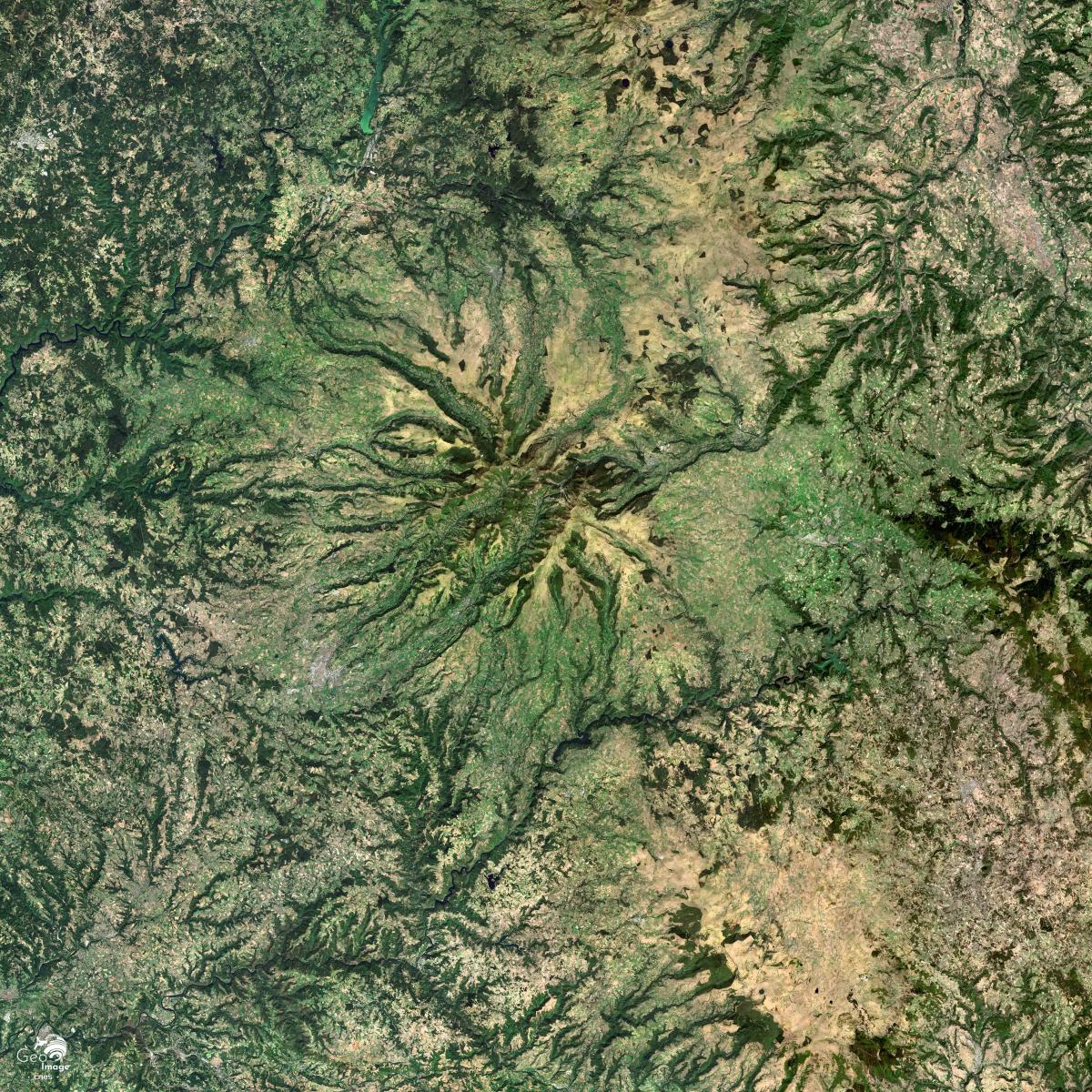 Comme le montre l’image générale ici présentée, le Cantal est une région naturelle du Massif central fortement caractérisée par le volcanisme. Le Plomb du Cantal, avec ses 1 855 m, est le point culminant d’un immense stratovolcan – le plus étendu d’Europe – et dont le cratère effondré forme une vaste caldeira. Taraudés par un réseau de vallées divergentes (Allagnon, Jordanne, Cère, Santoire…), les flancs du cône volcanique constituent des plateaux inclinés, les planèzes, dont les sols issus de la décomposition des roches volcaniques offrent des terroirs agricoles de production de qualité – aussi bien pour les productions végétales que pour l’entretien de riches STH (surfaces toujours en herbe).