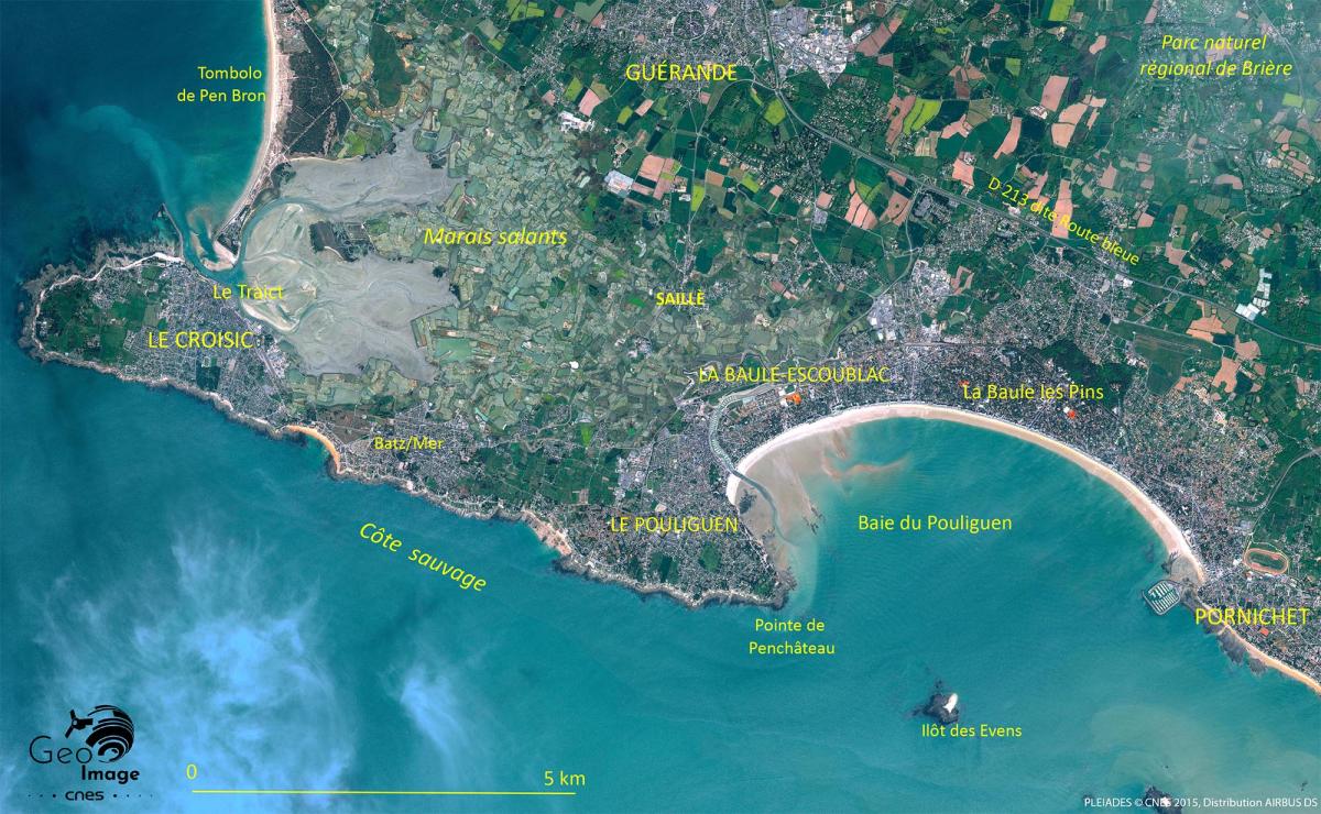 La côte littorale habitée oppose deux types de paysages. De la presqu’ile du Croisic jusqu’à la pointe de Penchâteau au Pouliguen, ce sont les affleurements rocheux de schiste et de granit qui dominent. Ils sont ponctuellement interrompus par des plages ou par des criques sableuses. La côte sauvage de la presqu'île guérandaise, frange rocheuse du littoral, s'étend du Croisic au Pouliguen, en passant par Batz-sur-Mer. A l’ouest et au sud-est de l’image, on trouve des rivages sableux : la longue baie de La Baule qui s’étend sur 9 km, ce qui en fait un site assez exceptionnel, et le tombolo de Pen-Bron, qui ferme les marais de Guérande.