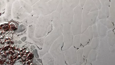 New Horizons a observé des brumes atmosphériques d’azote en millefeuille nettement visible, une grande diversité de reliefs, avec quelques cryovolcans, l’absence notable de cratères sur certaines régions (notamment “la plaine Spoutnik” : le plus grand glacier du Système solaire composé d’azote), des montagnes de glace d’eau, des déplacements de glaciers. La surface de la planète naine semble jeune.